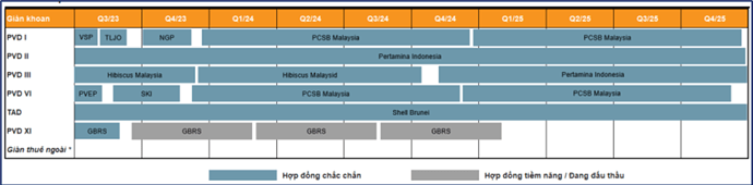 - Giàn khoan PVD III: tiếp tục khoan tại Hibiscus Malaysia đến giữa năm 2024 với hợp đồng gia hạn từ cuối năm 2023 (với giá thuê cao hơn nhiều so với hợp đồng cũ)