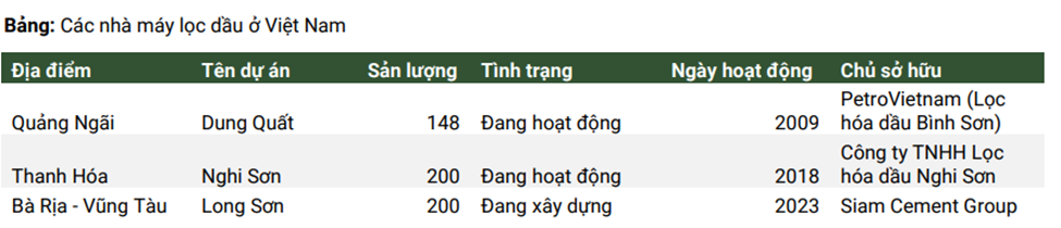 Việt Nam có hai nhà máy lọc dầu là Dung Quất và Nghi Sơn. Số liệu của Tổng cục Hải quan cho thấy, năm 2021 Việt Nam xuất khẩu hơn 3,1 triệu tấn dầu thô, với giá trị xuất khẩu là trên 1,76 tỷ USD. Ở chiều ngược lại, Việt Nam cũng nhập khẩu hơn 9,9 triệu tấn dầu thô với giá trị nhập khẩu là trên 5,15 tỷ USD. Lượng dầu thô nhập khẩu chủ yếu phục vụ cho hai nhà máy lọc hóa dầu là Nghi Sơn và Dung Quất.