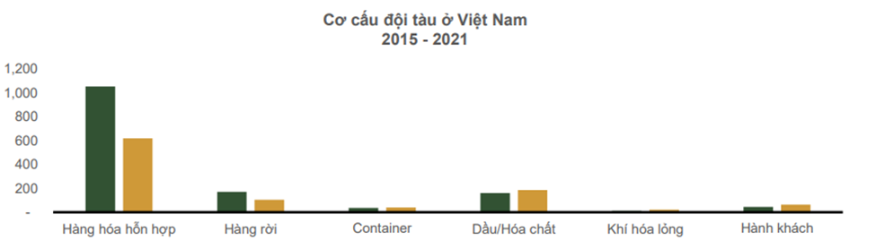 Theo Cục Hàng hải Việt Nam (Vinamarine), cơ cấu theo đội tàu vẫn chưa có đột phá từ năm 2015 đến năm 2021, nhưng đã có sự chuyển dịch tích cực sang trọng tâm là tăng trọng tải trên mỗi tàu (+6% trong cả giai đoạn). Đặc biệt, đội tàu Dầu/Hóa chất và Khí hóa lỏng đã có sự tăng trưởng đáng kể cả về số lượng và trọng tải, phần lớn là từ các thương vụ mua sắm trong năm 2021 của PVTrans, bao gồm NV Aquamarine, tàu VLGC (Very Large Gas Carrier) đầu tiên và là tàu chở khí hóa lỏng lớn nhất (hơn 81,000 bcm) tại Việt Nam. Năm 2021, lượng hàng lỏng thông qua hệ thống cảng biển trong nước của đội tàu Việt Nam đạt 41 triệu tấn, tăng 12% so với năm 2015 (36.6 triệu tấn), chiếm 55% tổng lượng hàng hóa. Với một số tàu chở dầu mới được đầu tư vào cuối năm 2020 và đầu năm 2021, dự kiến trong thời gian tới, lượng hàng lỏng chủ yếu sẽ do đội tàu trong nước đảm nhận. Hiện nay, hầu hết các tàu chở dầu lớn của Việt Nam được cho các đối tác nước ngoài thuê để hoạt động trên các tuyến quốc tế.