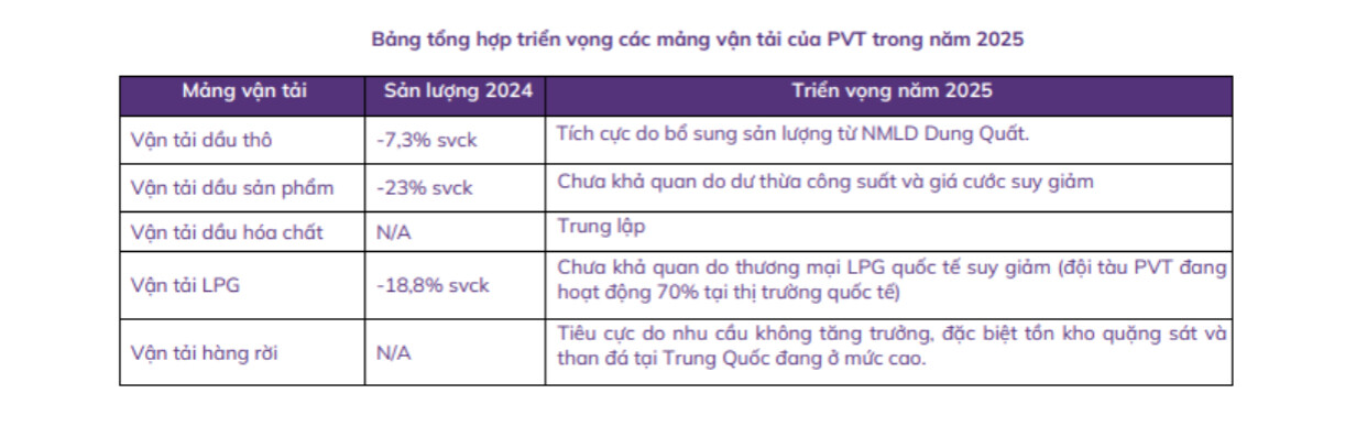 Dù sản lượng vận chuyển năm 2024 giảm 7,3% so với cùng kỳ do NMLD Dung Quất tạm ngừng bảo dưỡng, PVT vẫn duy trì sản lượng ở mức 5,1 triệu tấn nhờ đội tàu chuyên dụng gồm 2 tàu Aframax khai thác nội địa và 1 tàu hoạt động quốc tế nhằm tối ưu hóa hiệu quả. Triển vọng năm 2025 cải thiện đáng kể khi NMLD Dung Quất dự kiến vận hành vượt 100% công suất (105–116%), giúp nhu cầu vận chuyển dầu nội địa gia tăng rõ rệt.