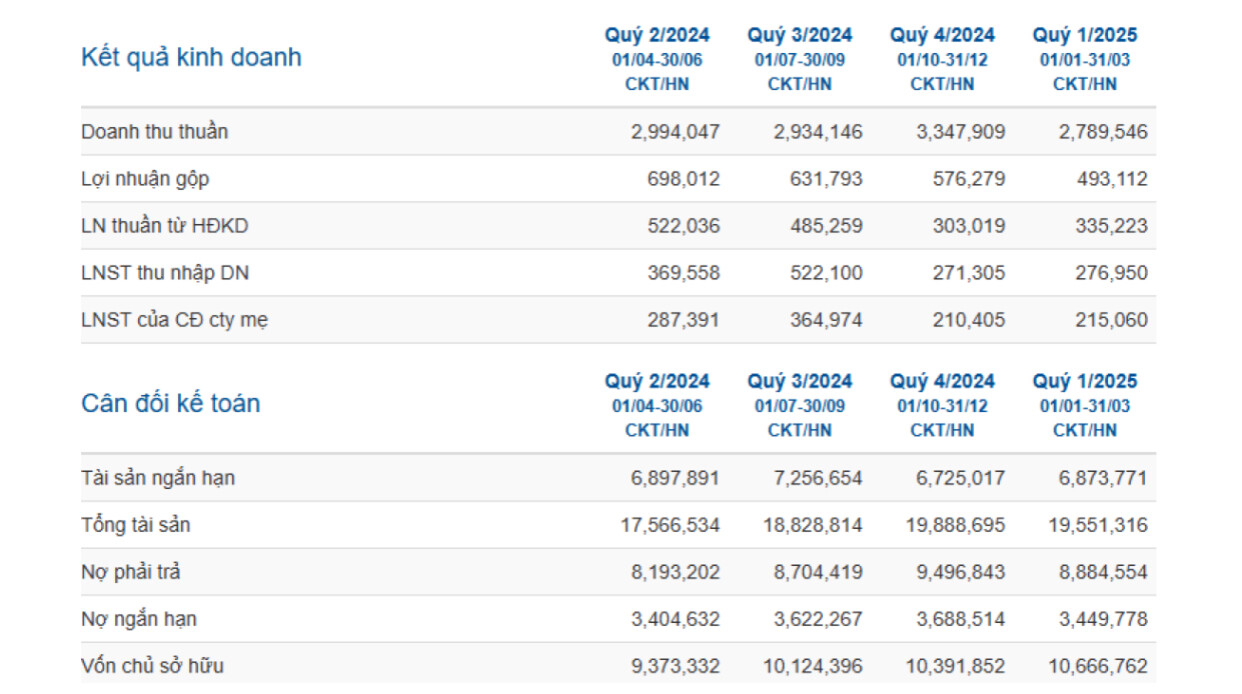 Trong quý 1/2025 (từ ngày 01/01 đến 31/03), Tổng công ty Cổ phần Vận tải Dầu khí (PVT) ghi nhận doanh thu thuần đạt 2.789,546 tỷ đồng, cho thấy sức tăng trưởng khá tích cực so với cùng kỳ. Tuy nhiên, các chỉ số lợi nhuận lại ghi nhận sự sụt giảm. Lợi nhuận gộp đạt 493,112 tỷ đồng, trong khi lợi nhuận thuần từ hoạt động kinh doanh đạt 335,223 tỷ đồng. Lợi nhuận sau thuế của doanh nghiệp là 276,950 tỷ đồng, và lợi nhuận sau thuế của cổ đông công ty mẹ đạt 215,060 tỷ đồng.
