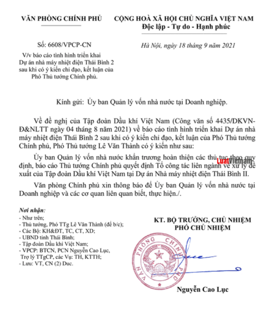 23/9/2021: Công văn 6608/VPCP-CN 2021 về tình hình triển khai Dự án nhà máy nhiệt điện Thái Bình 2