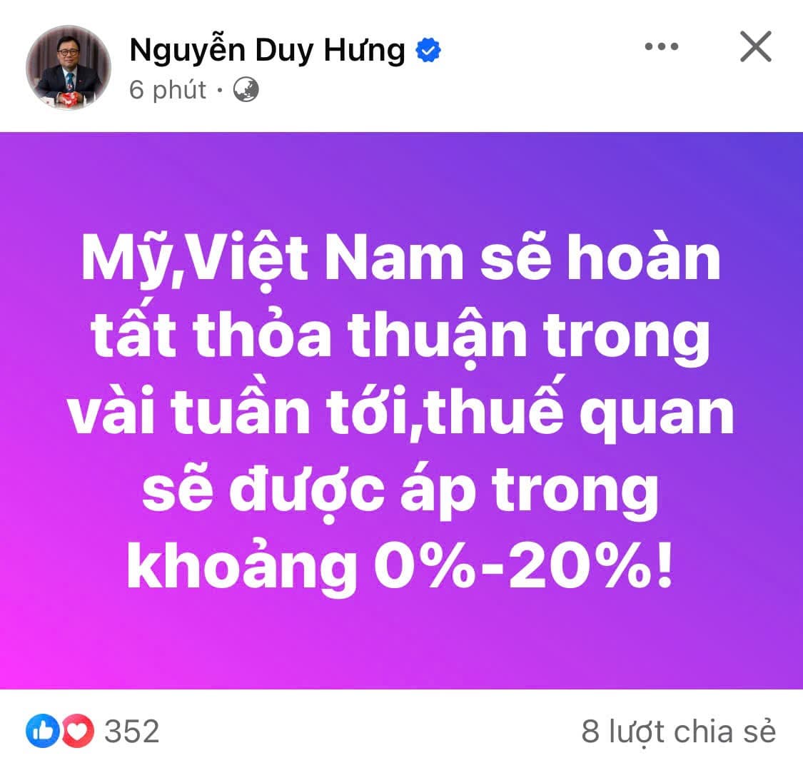 Thuế quan của Mỹ sẽ giảm xuống 0% đối với một số sản phẩm của Việt Nam. Trong thỏa thuận mới, Hoa Kỳ sẽ duy trì mức thuế quan đối với hàng hóa Việt Nam ở mức 20%, nhưng sẽ xác định những sản phẩm có thể giảm thuế xuống 0.
