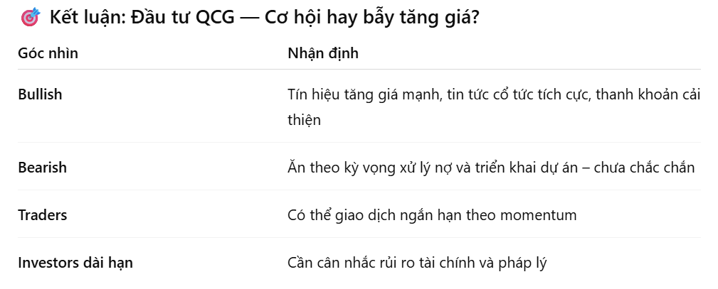 Tóm lại: QCG đang là cổ phiếu “điểm nóng” về biến động giá và câu chuyện doanh nghiệp, nhưng rủi ro tài chính và triển vọng dự án vẫn chưa được giải quyết rõ ràng. Nhà đầu tư nên kết hợp phân tích kỹ thuật — cơ bản và theo dõi sát các tin nội bộ doanh nghiệp trước khi quyết định giải ngân.