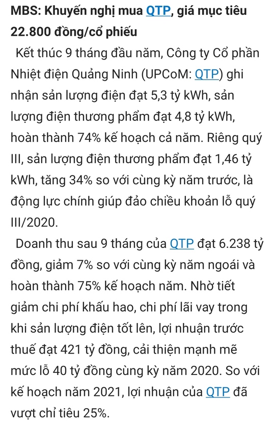 Sản lượng điện quý 3/2021 của QTP tăng 34% so cùng kỳ.