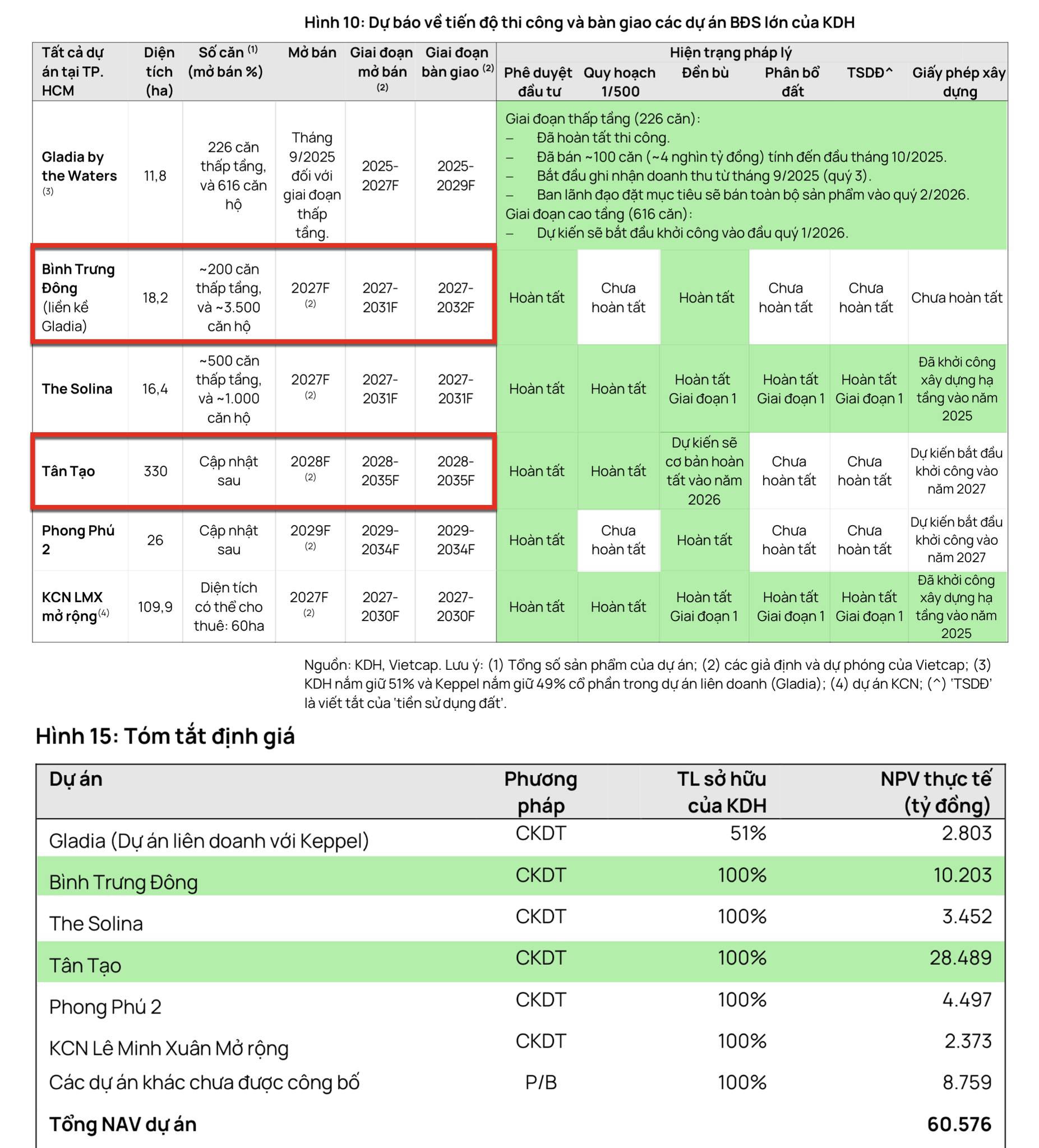 Còn với Gladia, một dự án hiện đang mở bán và đang được kể chuyện nhiều, thì đó lại không phải dự án key định giá lúc này. Giá trị mà Gladia có thể mang lại cho KDH được ước tính chỉ vào khoảng 3.000 - 5.000 tỷ đồng, tức rất nhỏ so với Tân Tạo và Bình Trưng Đông.