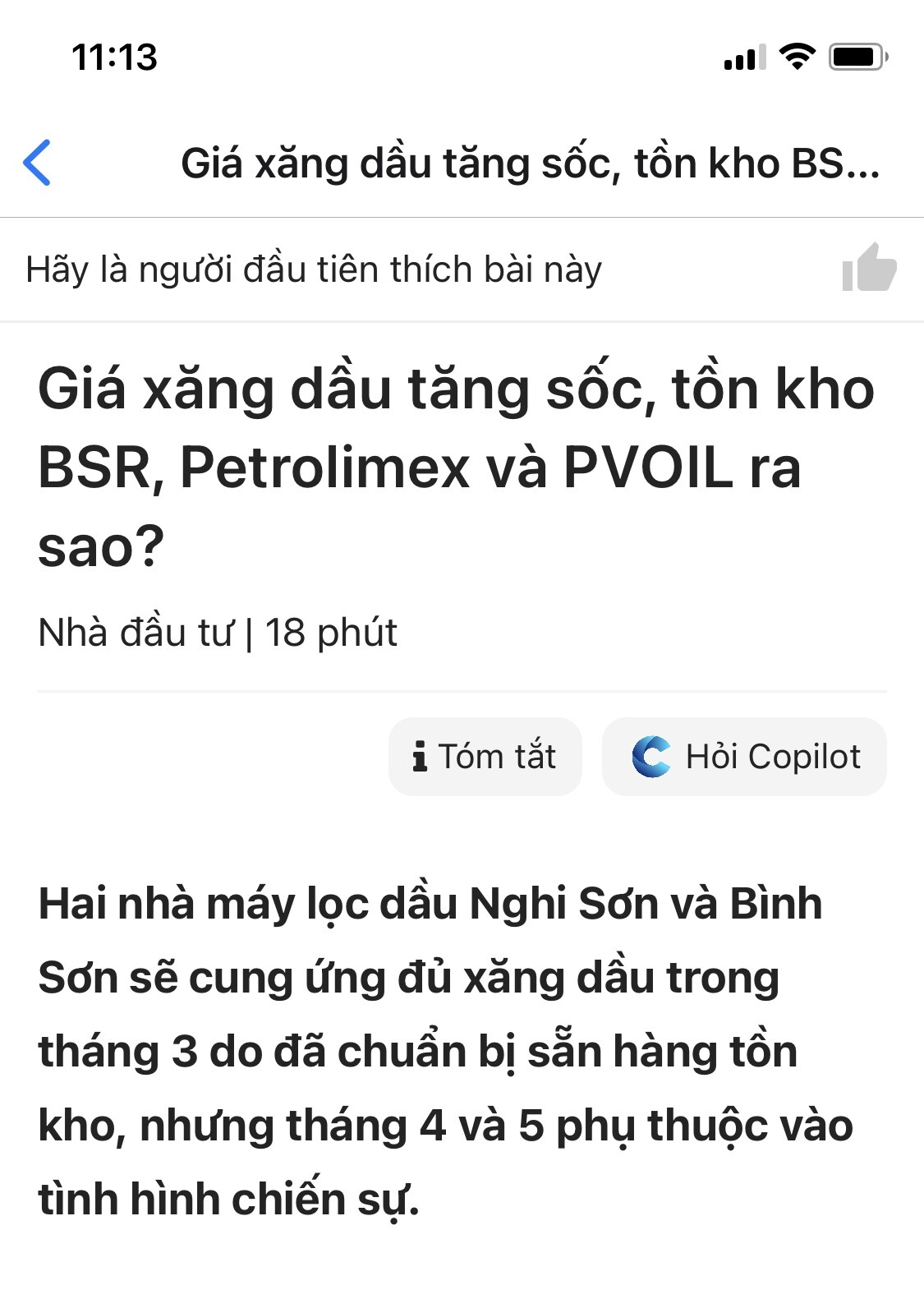 Tôi nói có sai đâu dầu thô tồn kho của BSR chỉ đủ lọc trong 1 tháng. Sau đó BSR phải nhập dầu thô giá cao về lọc. Nếu không nhập đủ thì doanh thu lợi nhuận CHẮC CHẮN SỤT GIẢM giống như GAS nhập khí. Nếu nhập đủ cũng không hưởng lợi vì giá nhập cao trên đỉnh. Vậy mà giá cổ phiếu BSR đã tăng 300% rồi còn hô hào người dưng vào FOMO để lái truyền cục than hồng đúng đỉnh cho nhỏ lẻ ôm