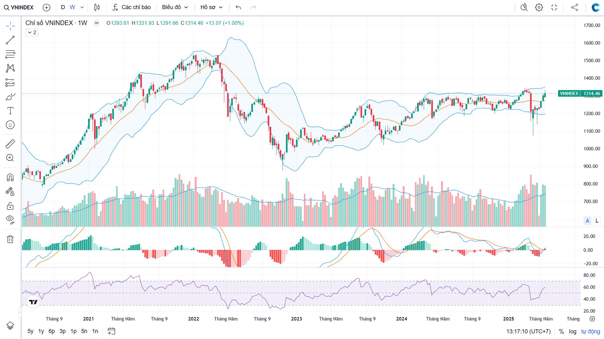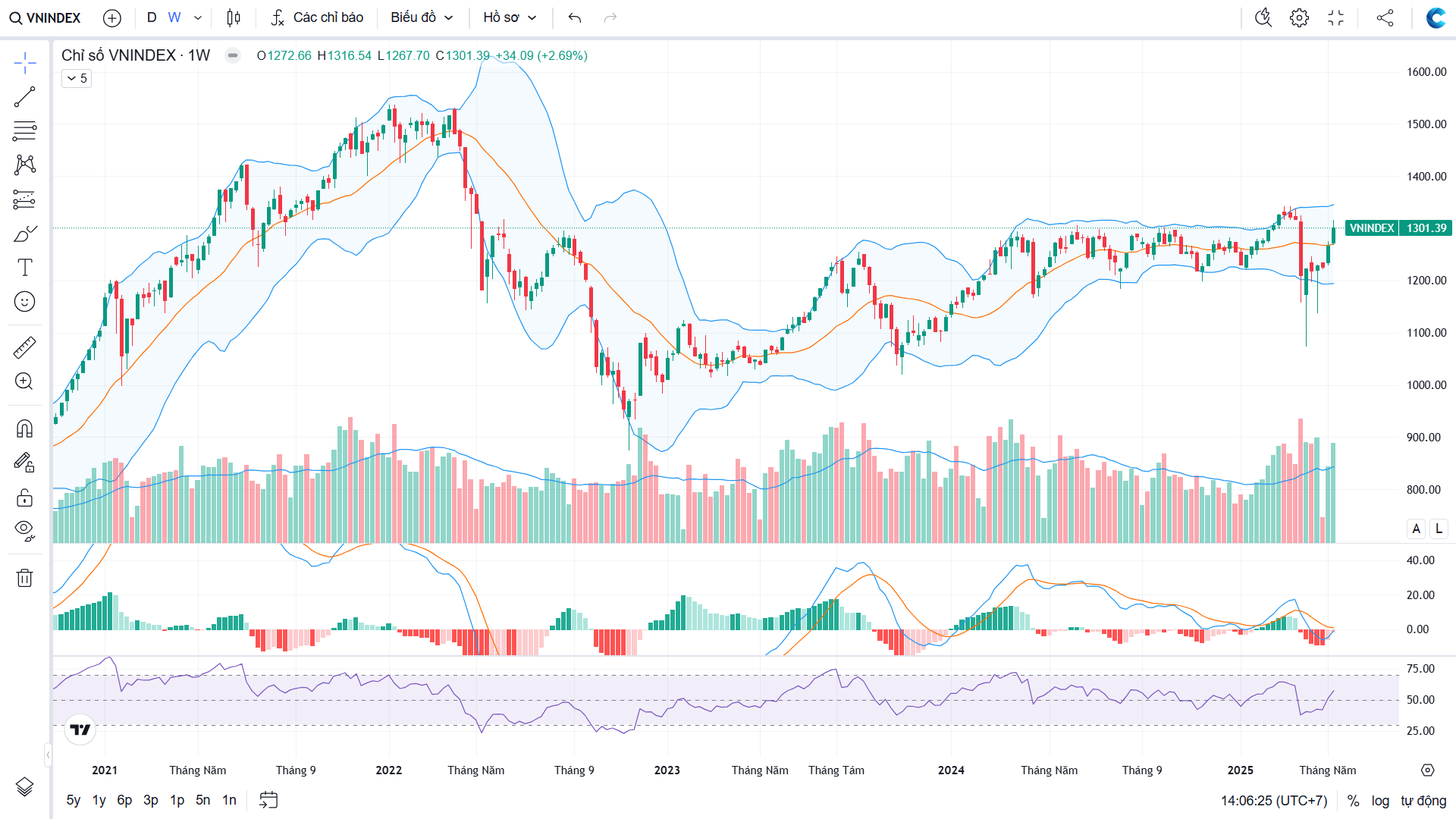 Sau 2 tuần tăng điểm vượt qua kháng cự 1300đ thì VNI trong tuần này tiếp tục hồi lại về đỉnh trước cú sập thuế quan. Điểm tích cực nữa là trend trung hạn của VNI đã thiết lập trở lại với tín hiệu MACD tuần cắt lên. Họ Vin và họ GEX là 2 nhóm ngành tạo động lực cho thị trường đồng thời tiền có dấu hiệu lan tỏa sang Midcaps. Tuy nhiên 2 phiên cuối tuần xuất hiện rung lắc khi 2 nhóm trên bị chốt lời là tín hiệu cần lưu ý.