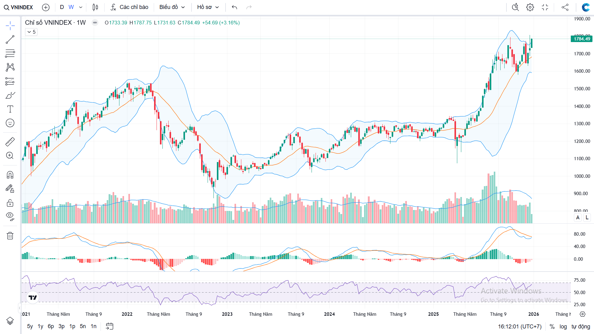 Chốt tuần giao dịch 29-31/12 thị trường hồi phục trở lại với 3 phiên tăng liên tiếp. VNI kết tuần với cây nến xanh tuyệt đối với mức đóng cửa cao gần nhất tuần tại 1784.49đ, tăng 54.69đ (+3.16%) so với tuần trước đó, đồng thời tạo nên mức tăng 518đ trong năm 2025.