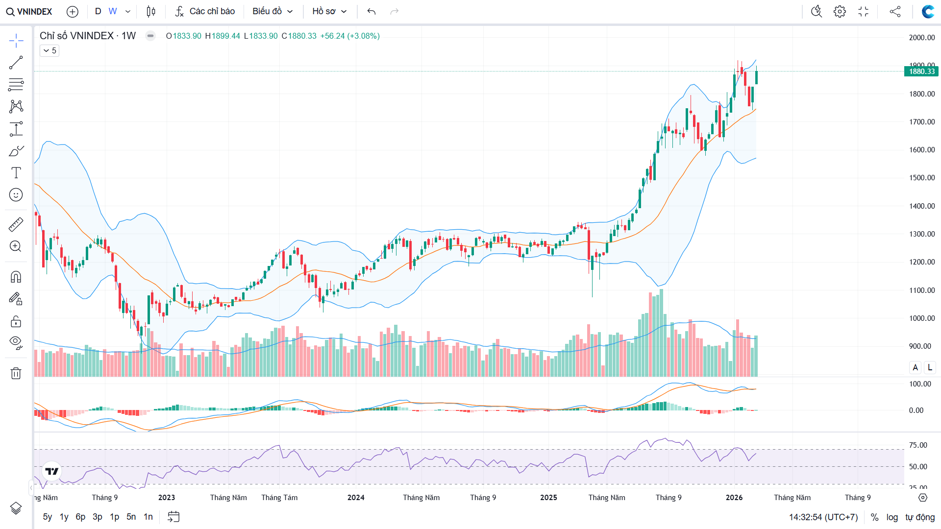 NĐT tuần qua hứng khởi quay lại thị trường giúp thanh khoản tăng 40% so với tuần trước Tết. Tuần giao dịch đầu tiên của năm Bính Ngọ sắc xanh lan tỏa thị trường đặc biệt ở các nhóm Dầu khí, Thép, Vận tải biển, Hóa chất – Phân bón, Dệt may, … Một số nhóm ngành tăng do được hưởng lợi khi Mỹ bãi bỏ thuế đối ứng và chỉ áp thuế toàn cầu 10%. Tuy nhiên VNI có dấu hiệu bán xuống trong phiên cuối tuần khi tiệm cận vùng 1900đ, đặc biệt nhóm BĐS bị bán ở mức khá cho thấy rủi ro điều chỉnh ở vùng đỉnh cũ.