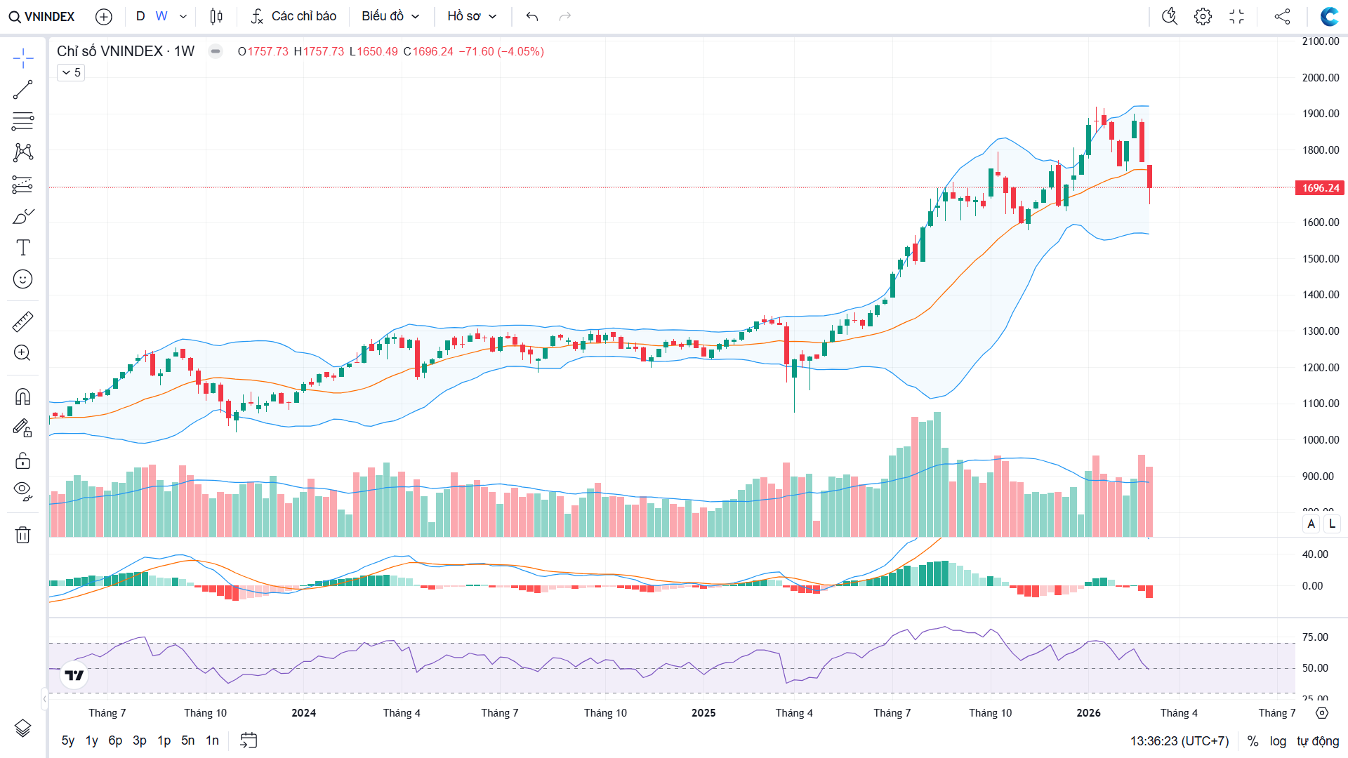 VN30 có biên dao động hơn 100đ khi test 1900đ thất bại và kết tuần tại 1797.99đ, giảm 55.61đ (-3%) với chỉ 4 mã tăng là VRE SSB VHM VJC.