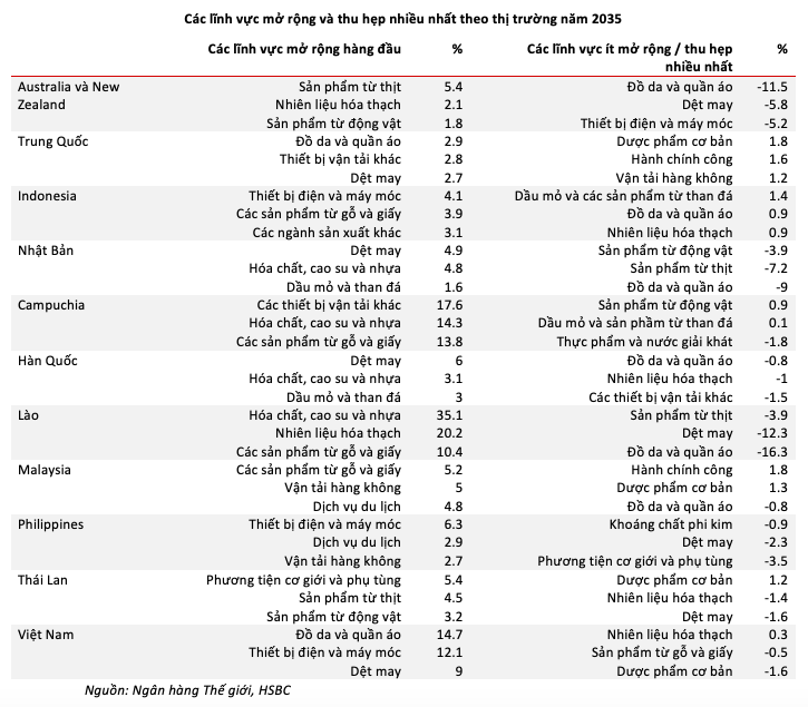 - Theo tổ chức này, đến năm 2035, ba ngành của Việt Nam được kỳ vọng sẽ mở rộng nhiều nhất là đồ da và quần áo (kỳ vọng mở rộng 14,7%), thiết bị điện và máy móc (mở rộng 12,1%), dệt may (mở rộng 9%). Trái lại, ba lĩnh vực là nhiên liệu hóa thạch; sản phẩm từ gỗ và giấy; dược phẩm cơ bản được cho là thu hẹp nhiều nhất.