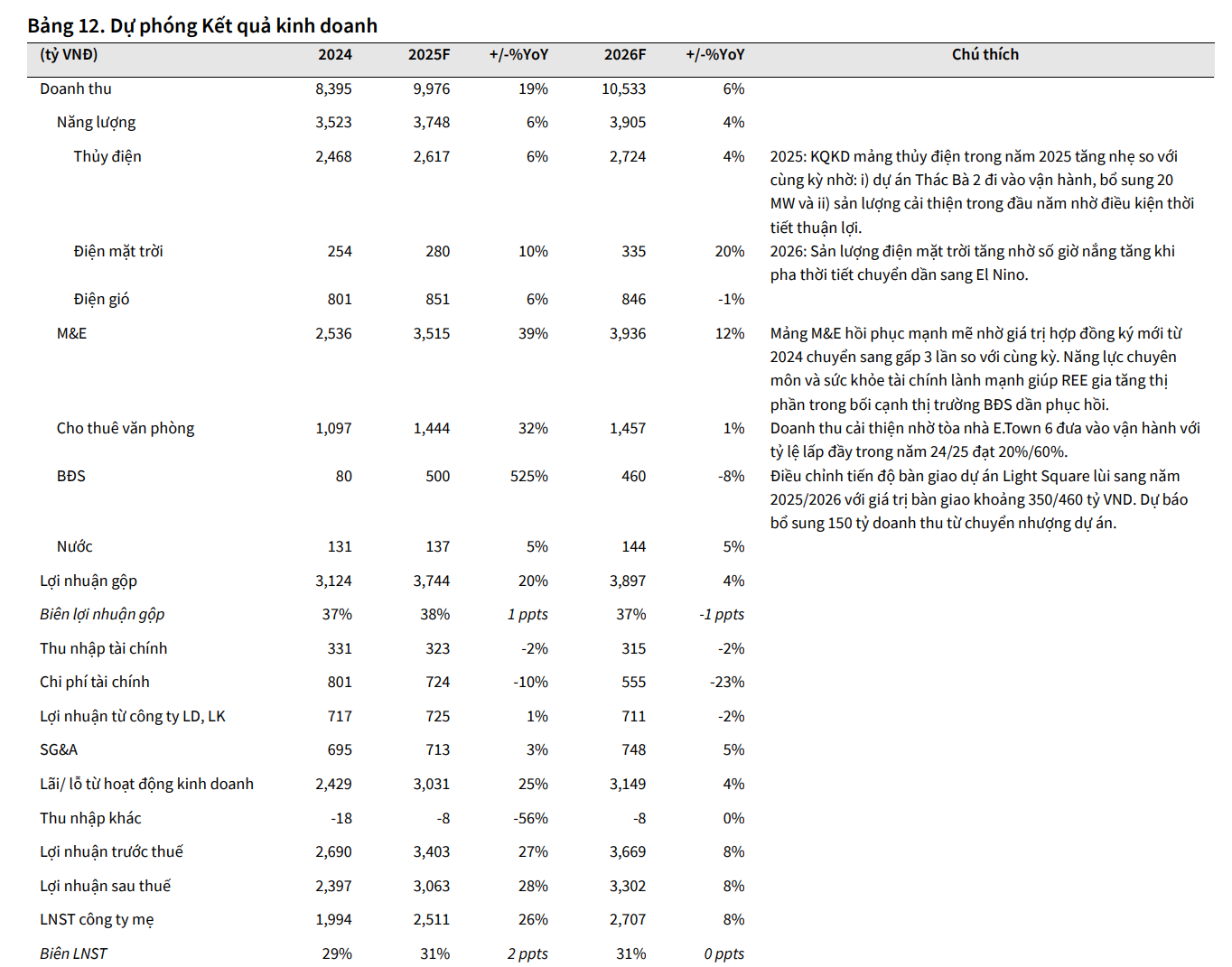 Dự phóng backlog ký mới và doanh thu năm 2025 của REE cho mảng M&E sẽ tăng trưởng tích cực, đạt 5,825 tỷ VND (+16% YoY) và 3,515 tỷ VND (+39% YoY) nhờ doanh nghiệp tiếp tục ghi nhận khối lượng lớn công việc của sân bay Long Thành. Nhìn sang 2026, nguồn việc sẽ dồi dào hơn cho REE nhờ khung giá đất đã được ban hành sẽ đem lại kì vọng phục hồi của thị trường BĐS và giúp doanh thu của REE đạt 3,936 tỷ VND (+12% YoY).