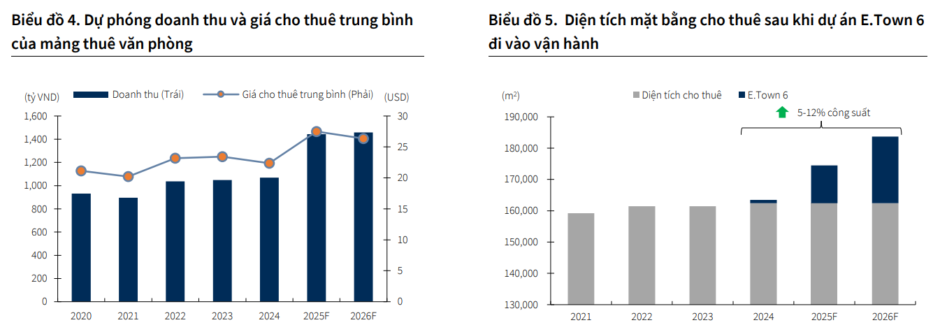 Dự phóng doanh thu và LNST của mảng cho thuê văn phòng trong năm 2025 sẽ đạt 1,321 tỷ VND (+20% YoY) và 594 tỷ VNĐ (+24% YoY). Về dài hạn, CBRE nhận định xu hướng các khách hàng lĩnh vực công nghệ thông tin mở rộng hoạt động nhằm tận dụng sự phổ cập nhanh chóng của AI và đội ngũ nhân lực dồi dào trong nước sẽ dẫn dắt nhu cầu thuê văn phòng. Theo đó, ước tính tòa nhà E.Town sẽ đạt tỷ lệ lấp đầy lần lượt là 75%/95% trong 2026/2027.