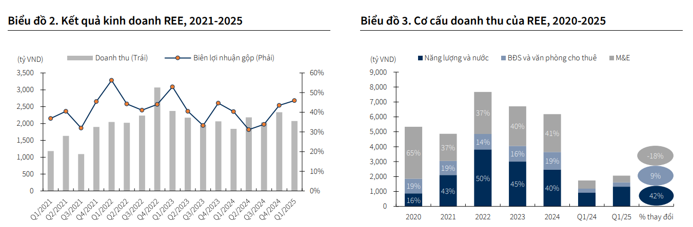 - REE có ba lĩnh vực hoạt động chính: điện (1.050 MW và chiếm gần 50% doanh thu), cơ điện lạnh (M&E) và cho thuê văn phòng. REE cũng có các công ty con trong mảng nước và bất động sản. Hiện tại, REE đang sở hữu 182.000 m2 diện tích văn phòng cho thuê.