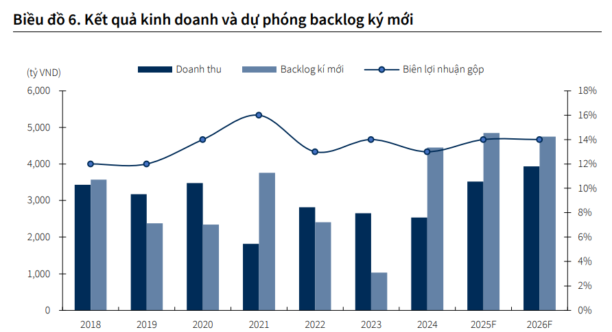 - Nhờ khối lượng công việc chuyển giao lớn sang năm 2025 (khoảng 4,500 tỷ VND) của dự án Long Thành, doanh thu 2025 sẽ được bảo đảm. Ngoài ra, khó khăn pháp lý của các dự án BĐS dần được tháo gỡ giúp giảm áp lực trích lập dự phòng.