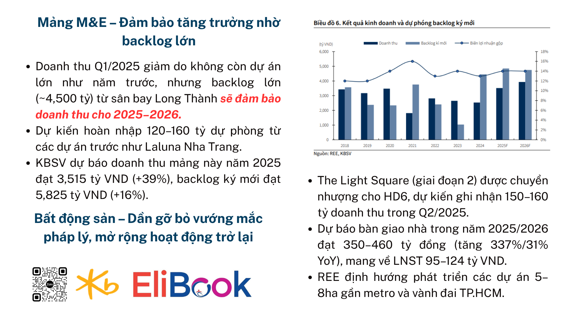 M&E giữ nhịp ổn định: Sân bay Long Thành đảm bảo backlog 4,500 tỷ cho 2025–2026. Dự báo doanh thu M&E tăng +39% YoY.