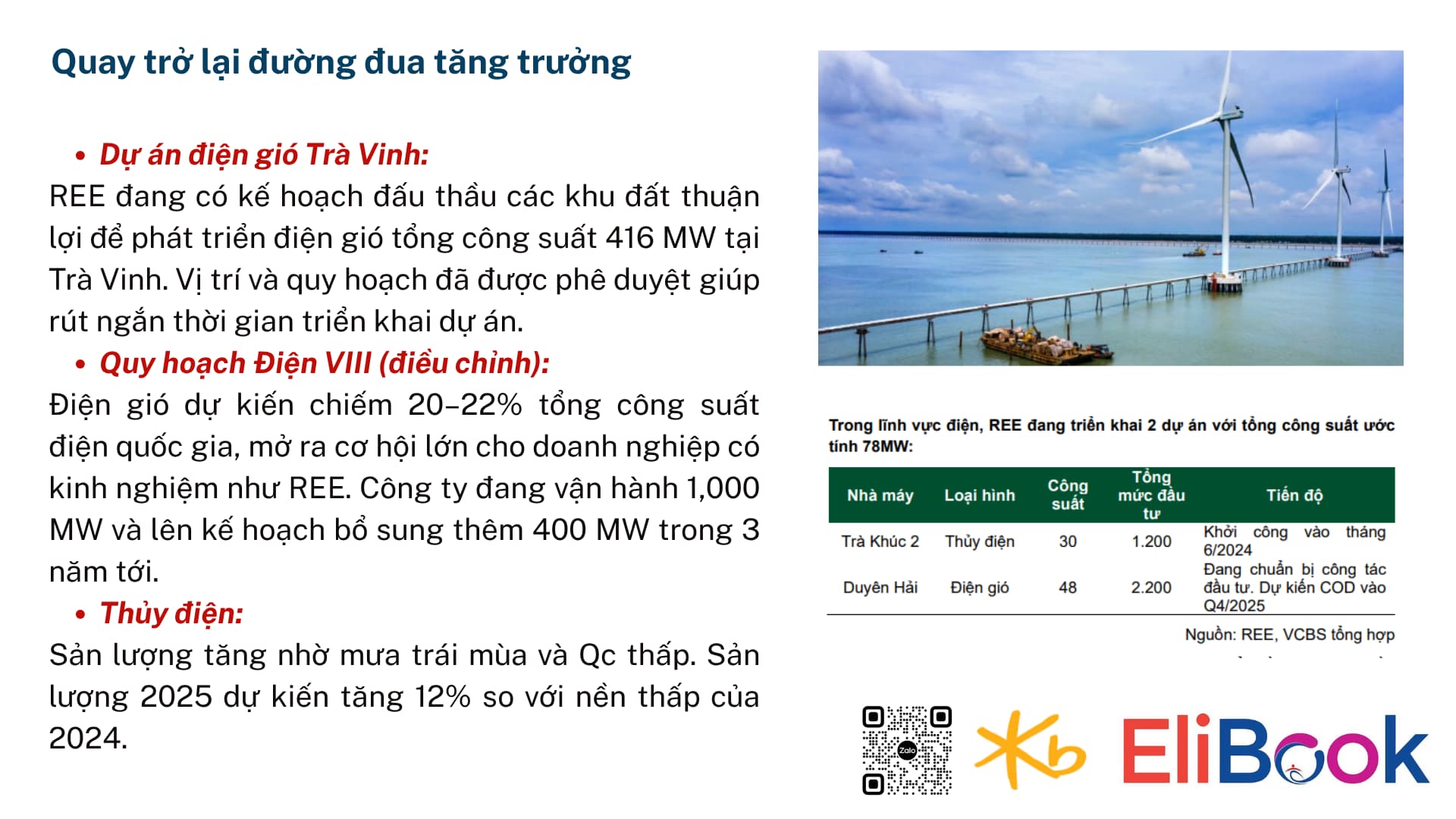 Hưởng lợi từ Quy hoạch Điện VIII điều chỉnh: Điện gió sẽ chiếm 20–22% tổng công suất phát điện toàn quốc. REE đang sở hữu >1,000 MW, dự kiến bổ sung thêm 100 MW trong 2025 và 300 MW trong 3 năm tới.