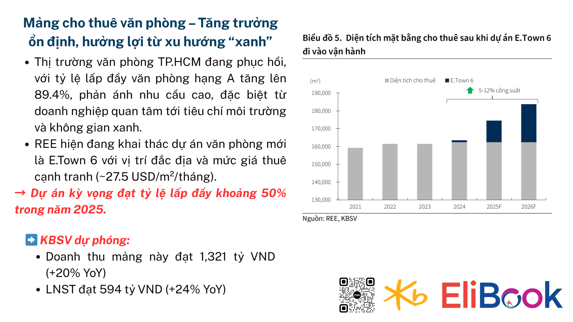 Mảng văn phòng cho thuê phục hồi: E.Town 6 hưởng lợi từ xu hướng xanh – kỳ vọng đạt 50% lấp đầy trong năm nay. Dự báo doanh thu & LNST mảng này tăng trưởng lần lượt +20% và +24% YoY.