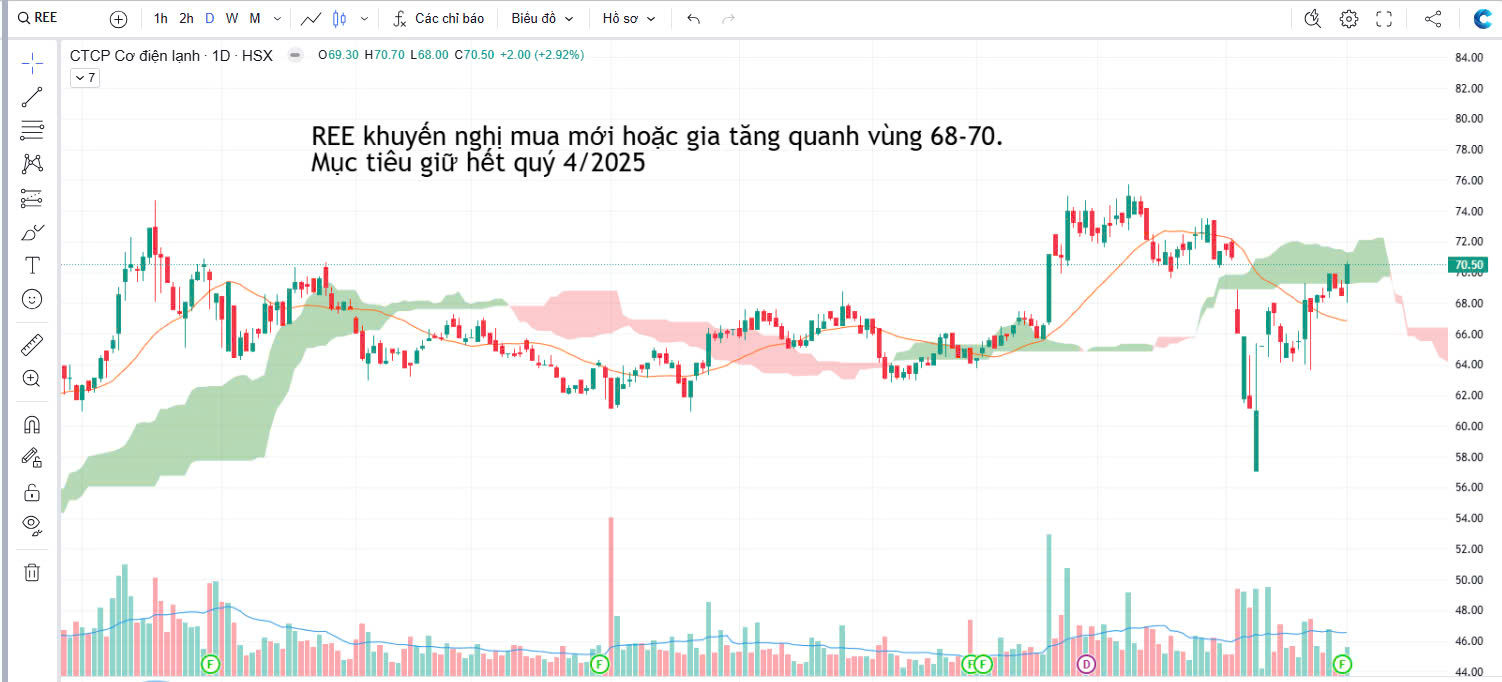 Anh Chị NĐT quan tâm và có cùng quan điểm với em có thể xem xét mua mới hoặc gia tăng nếu REE tụt về lại giá quanh 68-70.