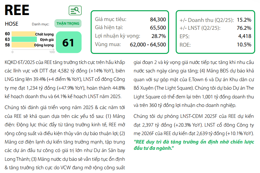 Với cơ cấu danh mục cân bằng giữa năng lượng, M&E và bất động sản cho thuê, cùng việc đa dạng hóa nguồn thu từ đầu tư tài chính, REE được kỳ vọng sẽ duy trì đà tăng trưởng lợi nhuận ổn định trong giai đoạn 2025–2026, đặc biệt khi điều kiện thủy văn và năng lượng tái tạo vẫn thuận lợi trong nửa cuối năm.