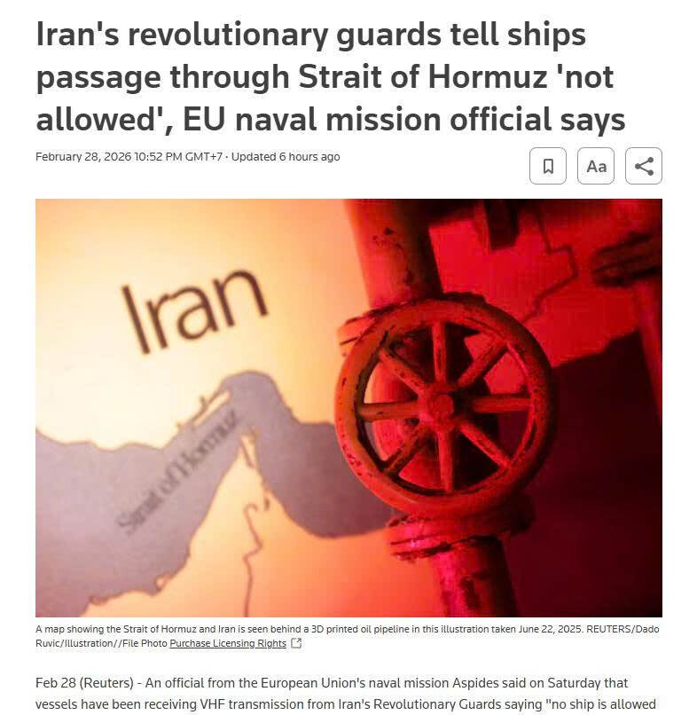 Lực lượng Vệ binh Cách mạng Iran tuyên bố tàu thuyền không được phép đi qua eo biển Hormuz.