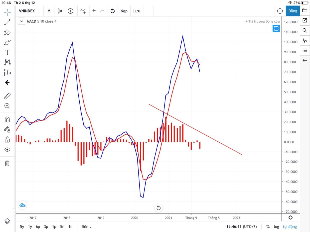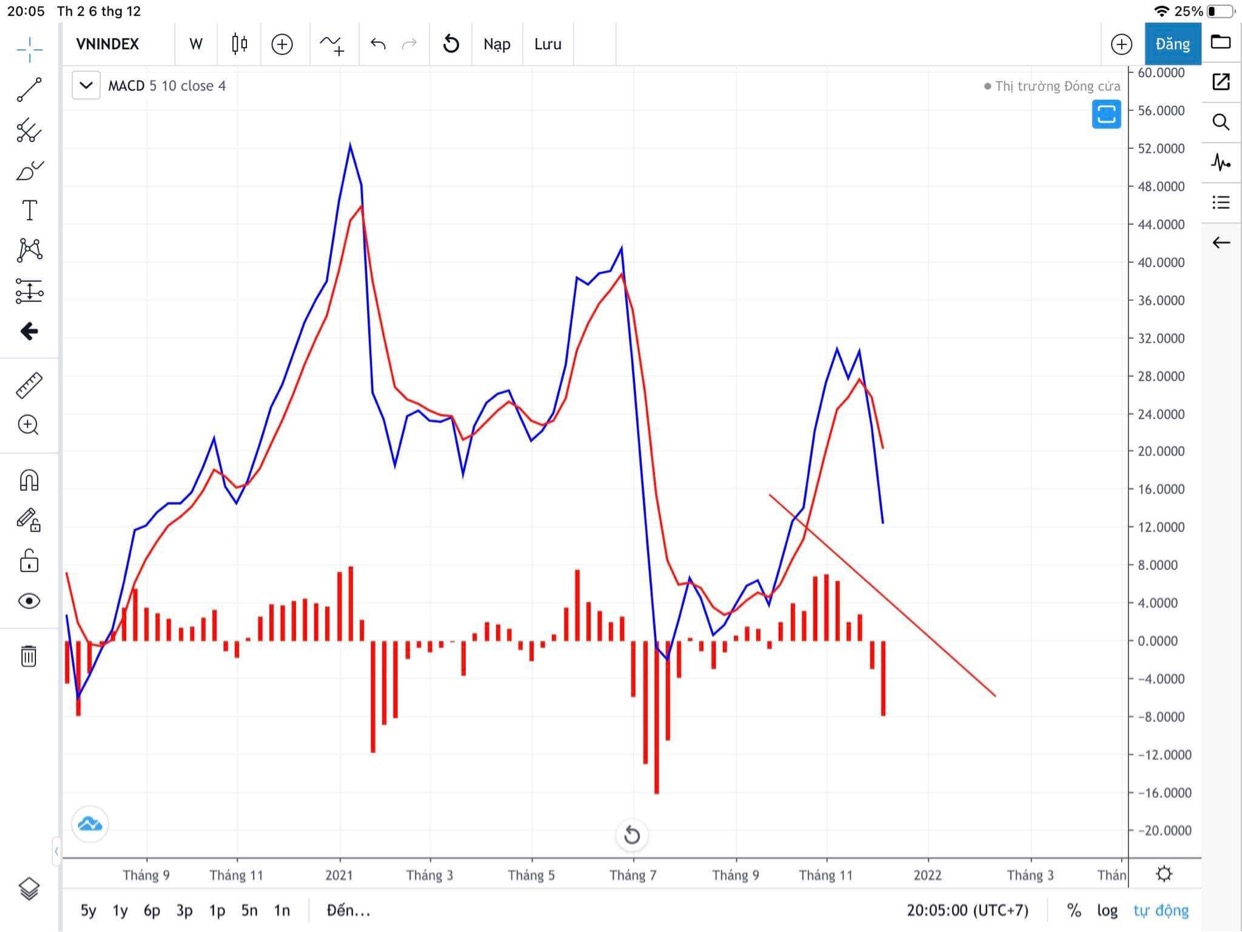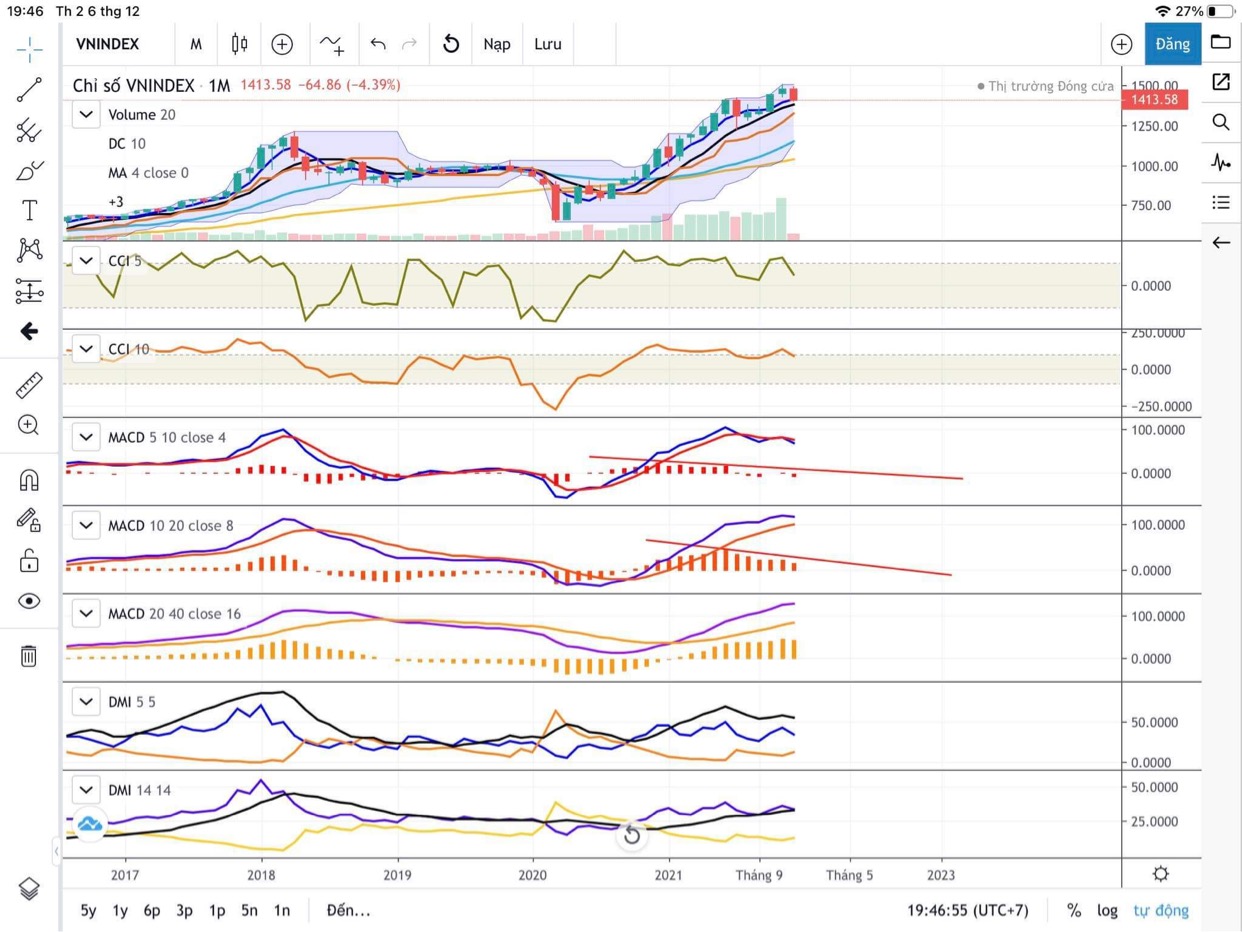 Chart tháng Vni như mình nói đầu tháng chỉ cần CCI 5 quay đầu ta sẽ có phân kì MACD nhanh tức là phase chỉnh tháng và thực sự sau 2 phiên xả mạnh, đã gãy adx 5 , tức là tạm thời gãy trend tháng. Thực sự về tháng Vni ntn về lâu dài sẽ ko đẹp đâu. Khi 3 MACD cùng xuống dưới 0 thì phase chỉnh tháng sẽ kinh khủng như hồi đầu năm or 2018. Mình đoán là tầm đầu 2022 ( nếu xấu có thể là trong năm nay luôn)