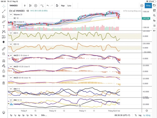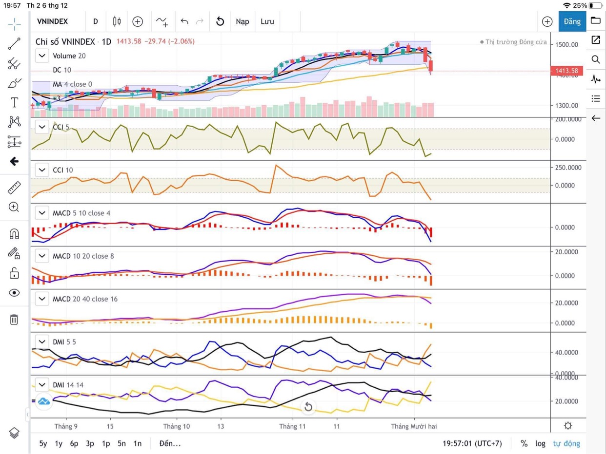 Tuần vni hiện tại rất xấu khi CCI 5 đã rơi vào vùng quá bán + gãy ADX, nhưng mình nghĩ sẽ còn rơi nữa khi CCI 10 vẫn chưa rơi vào vùng quán bán