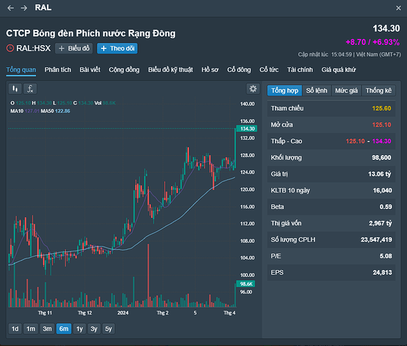 | Cổ phiếu RAL kết phiên 04/04 với vùng giá 134.300 đồng/cp |
