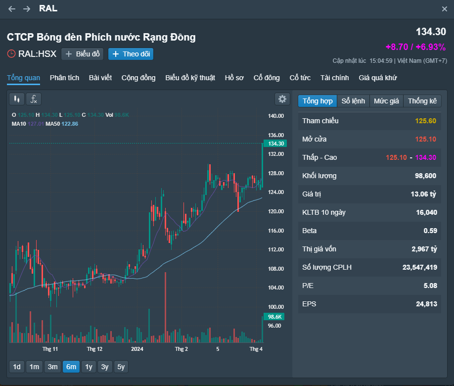 Đóng cửa phiên giao dịch ngày 4/4, cổ phiếu RAL tăng "kịch trần" lên vùng 134.300 đồng/cp, tương ứng mức tăng 6,93%.