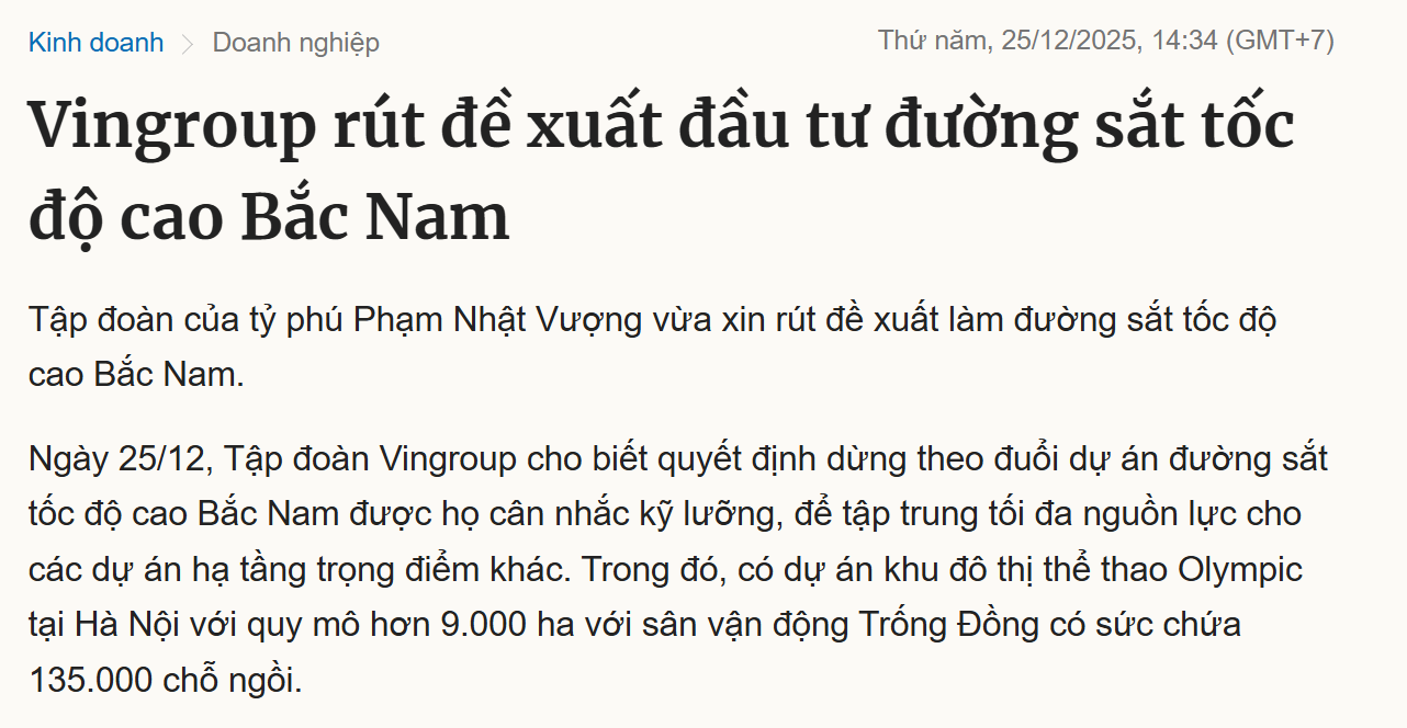 Việc Vingroup rút khỏi dự án Đường sắt cao tốc Bắc – Nam không nên được nhìn bằng lăng kính cảm xúc, mà bằng logic chiến lược.