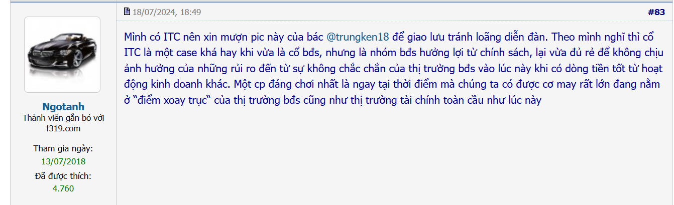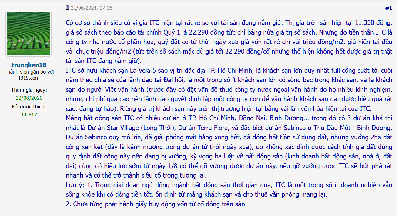 ITC thực sự là cổ chất nhất nhóm BĐS hiện tại trên tất cả các khía cạnh - tài sản dưới quá xa giá trị, dn đang chuyển động rất nhanh, dự án chuyển động rất nhanh, pháp lý, chính sách vĩ mô tháo gỡ và ủng hộ, dự án nằm trọn trong khu vực lõi trung tâm Đông Nam Á, hạ tầng phát triển, tỷ lệ đô thị hóa 85% cao nhất cả nước, đất sạch đã đóng tiền sử dụng đất mang lại chênh lệch địa tô quá lớn, ban lãnh đạo tâm huyết và rất nghiêm túc, và đặc biệt lại được hậu thuẫn bởi Quỹ phát triển Bình dương.