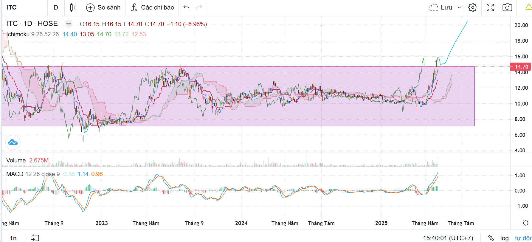 Trên góc nhìn kỹ thuật, ITC đã phá vỡ các cản và backtest. dự kiến giao dịch khó chịu 1 chút vùng 14-15 trước khi đi vòng 2. Vòng 2 này sẽ 1 mạch về 25, nếu cùng với việc dự án Sabinco tới đây. Còn khi Sabinco động thổ, tôi ko tin ITC còn giá 2x nữa. Vừa rồi RSI của ITC luôn ở vùng 80-90 là vùng rất ít cổ phiếu như vậy. Phiên nay chỉnh là đẹp, dự phiên mai cho chỉ số về 65-70 luôn.