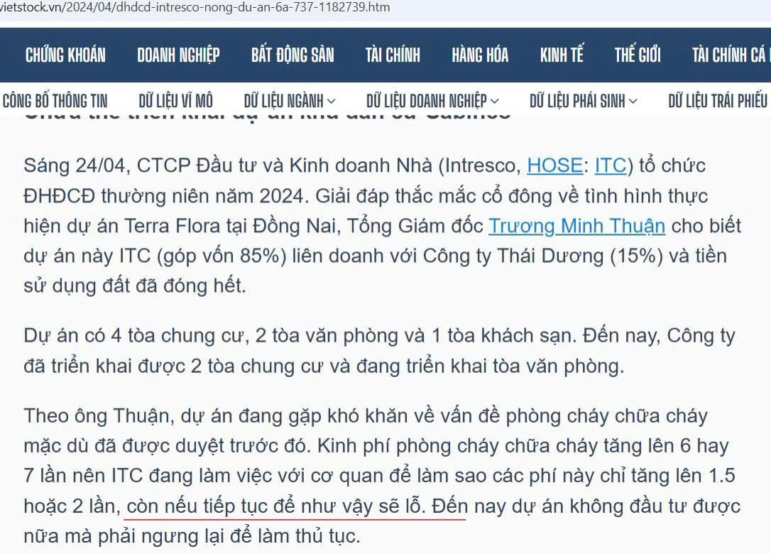 Đọc sơ bộ BCTC Q4 thì mảng BĐS bị lỗ. Doanh thu 24 tỷ, mà giá vốn là 28 tỷ. Đồng thời tồn kho dự án Terra Nhơn Trạch cũng giảm từ 24 tỷ trong quý 4 (từ 260 tỷ về 236 tỷ). Như vậy khả năng dự án Terra Flora Nhơn Trạch không hiệu quả. Có lẽ đây là những căn hộ ITC đã bán từ lâu trong thời gian bị kẹt dòng tiền nên chấp nhận giá bán không có lãi.