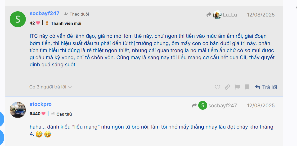 Mình là nhỏ lẻ, trước giờ vẫn là nhỏ lẻ chỉ biết nương theo thị trường mà ăn theo sóng lớn kiếm tiền. Đã mua ITC có lãi, giờ không tăng mạnh thì dừng mua mới để nương theo sóng khác, bao giờ ITC tăng mạnh có trend rõ thì mua mạnh trở lại. Còn nguyên nhân gốc rễ tại sao thì không cần phải giải thích vì có biết rõ ràng đâu mà tin hay chả tin.