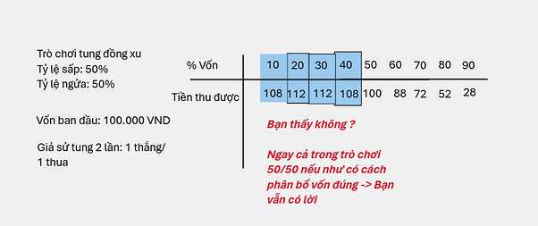Ngay cả trong một trò chơi với tỷ lệ thắng 50/50, nếu phân bổ vốn hợp lý và kiên nhẫn, người chơi vẫn có thể kiếm lời. Trong đầu tư tài chính, khi có lợi thế về phân tích kỹ thuật, phân tích cơ bản và kinh tế vĩ mô,… tỷ lệ thắng của nhà đầu tư sẽ còn cao hơn.