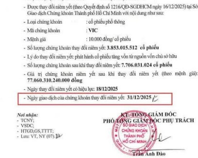 Sở Giao dịch Chứng khoán TP.HCM (HoSE) vừa thông báo về việc giao dịch chứng khoán thay đổi đăng ký niêm yết của Vingroup (mã VIC). Theo đó, gần 3,9 tỷ cổ phiếu VIC do Vingroup phát hành tăng vốn từ nguồn vốn chủ sở hữu sẽ được niêm yết bổ sung từ ngày 18/12. Ngày giao dịch chứng khoán thay đổi niêm yết là 31/12/2025