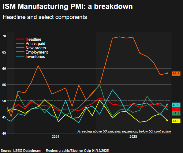 Khu vực sản xuất của Hoa Kỳ tiếp tục lao dốc trong tháng 11, đánh dấu tháng thứ chín liên tiếp suy giảm khi các nhà máy vật lộn với nhu cầu yếu và chi phí đầu vào tăng cao—hệ quả kéo dài của chính sách thuế nhập khẩu. Chỉ số PMI sản xuất của Viện Quản lý Nguồn cung (ISM) giảm xuống 48,2 từ mức 48,7 của tháng 10, duy trì dưới ngưỡng 50 phân tách mở rộng và thu hẹp hoạt động.