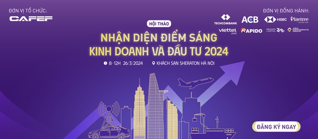 Hội thảo "Nhận diện điểm sáng kinh doanh và đầu tư năm 2024" do CafeF thuộc Công ty Cổ phần VCCORP tổ chức, với sự tham gia của các chuyên gia kinh tế đầu ngành và doanh nghiệp dẫn đầu các lĩnh vực công nghệ, tài chính, chứng khoán, bất động sản, sản xuất, tiêu dùng, năng lượng, xuất nhập khẩu như Ngân hàng Techcombank, ACB, HSBC, CTCK Pinetree, Dragon Capital, Rapido, Tập đoàn AIG, Viettel Post,…