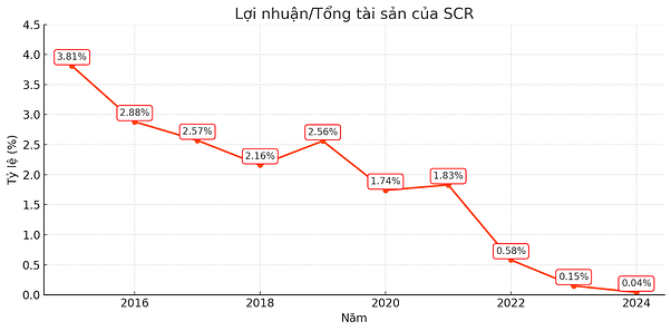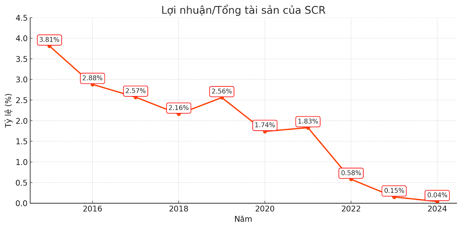 Dù tổng tài sản đạt gần 12.000 tỷ đồng (cuối Q1/2025), nhưng SCR nhiều năm qua không duy trì được tỷ suất sinh lời tương xứng. ROA trong suốt 10 năm hiếm khi vượt mốc 4%. Mục tiêu lợi nhuận trước thuế năm 2025 chỉ khoảng 50 tỷ đồng – tương đương lợi nhuận trên tài sản ~0,4%, phản ánh hiệu suất thấp hơn mặt bằng ngành bất động sản.