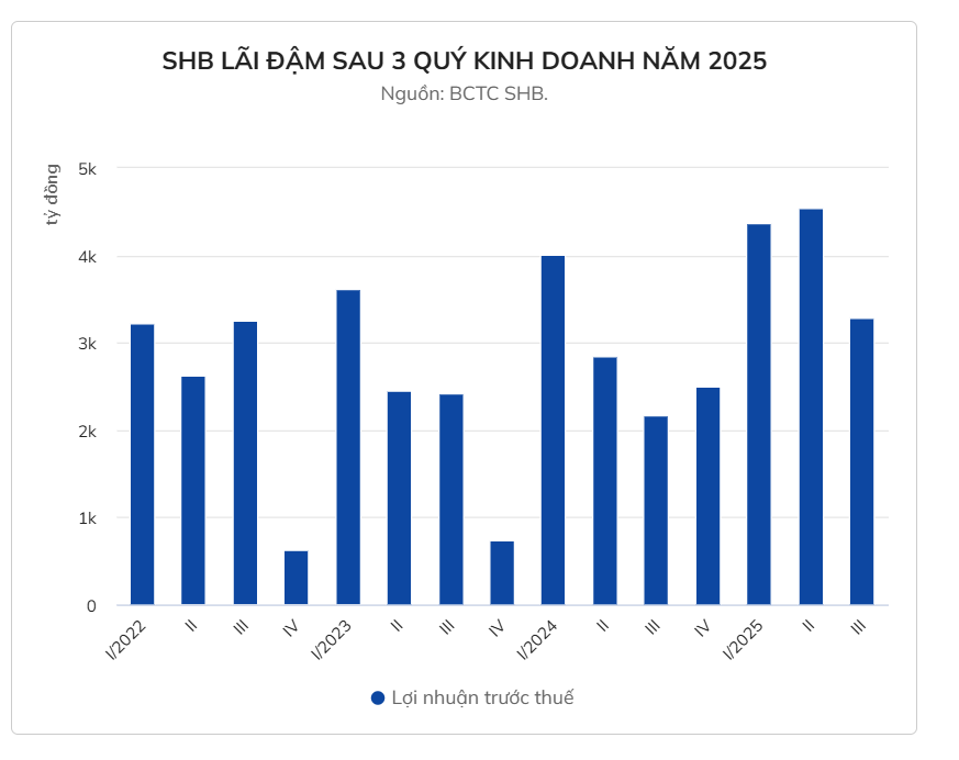 Năm 2025 ghi dấu một cột mốc lịch sử của SHB khi lần đầu tiên lợi nhuận trước thuế sau 9 tháng vượt ngưỡng 10.000 tỷ đồng, cụ thể đạt hơn 12.300 tỷ đồng, tăng trưởng 36% so với cùng kỳ năm trước. Kết quả ấn tượng này hoàn thành tới 85% kế hoạch lợi nhuận cả năm, cho thấy một sự bứt phá mạnh mẽ và hiệu quả trong hoạt động kinh doanh. Động lực chính đến từ sự tăng trưởng vượt bậc của thu nhập lãi thuần, đạt 5.324 tỷ đồng trong quý III, tăng 63% so với cùng kỳ. Bên cạnh đó, các mảng dịch vụ và kinh doanh chứng khoán cũng ghi nhận những bước nhảy vọt đáng kể, đóng góp tích cực vào bức tranh lợi nhuận chung.