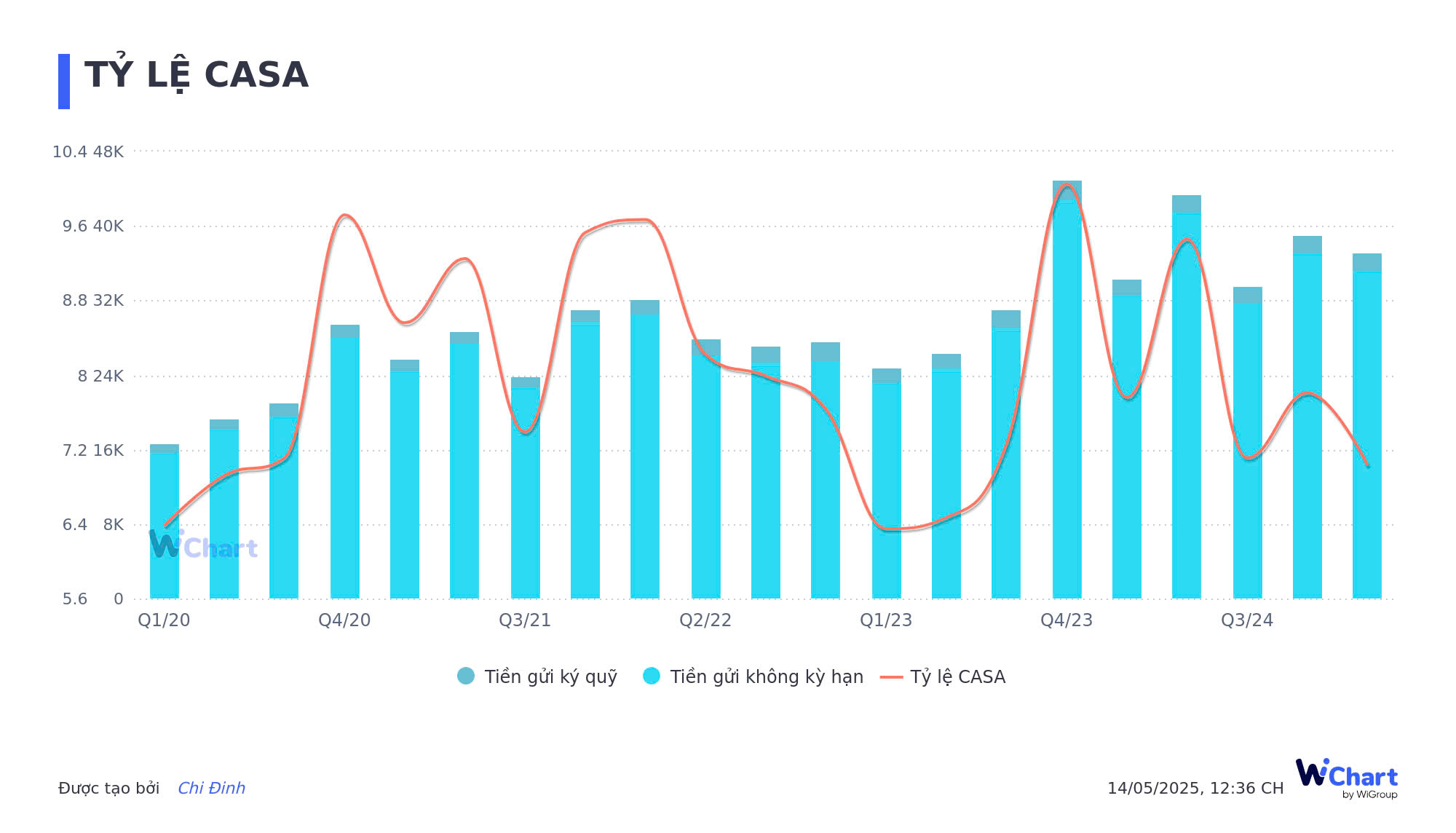 - Tăng trưởng tiền gửi tăng tốc mạnh trong quý 1 đạt 19,32% , tỷ lệ Casa giảm nhẹ 0,8% so với cuối năm 2024, trong bối cảnh toàn ngành ngân hàng giảm 1,4% trong Q1.