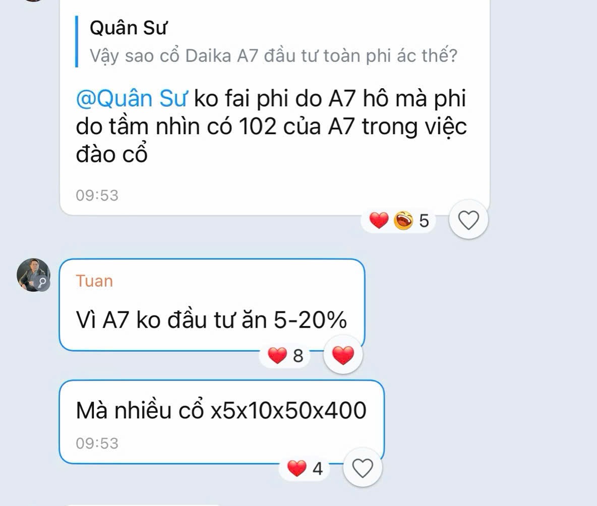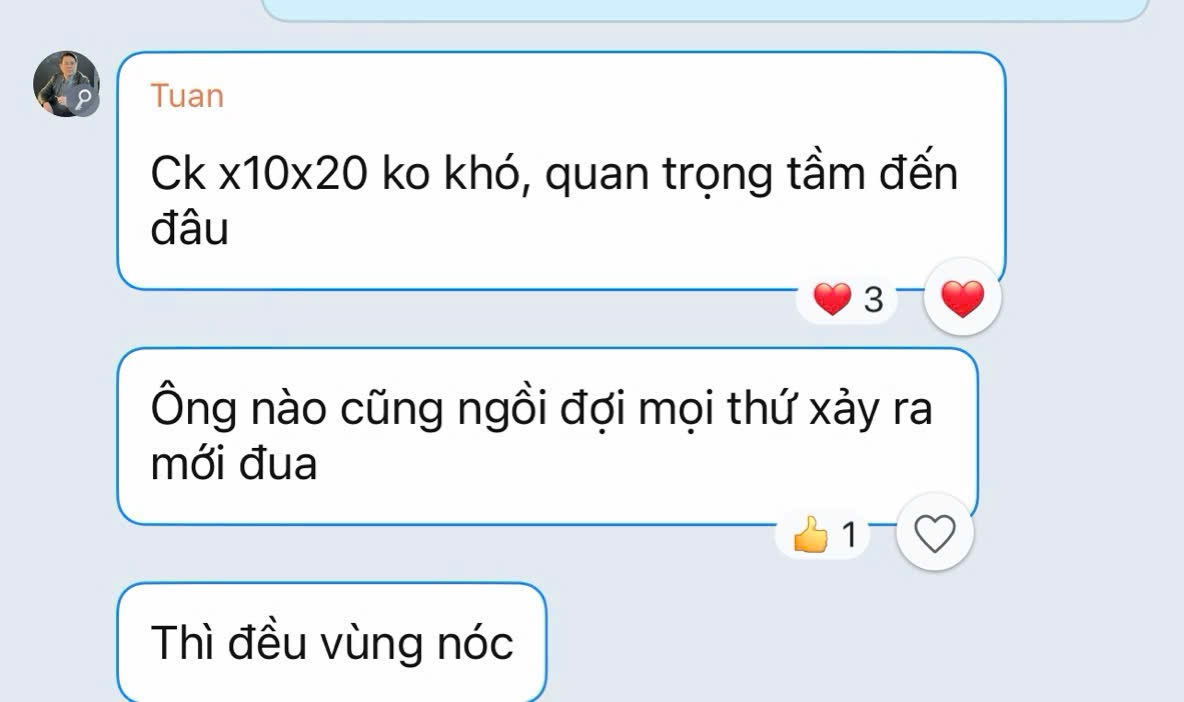 TƯ DUY TẦM NHIN a7 nó vượt tầm thơi đại - đâu tư chưng khoản là ky vọng tương lai - siêu ky vọng mua thứ cả xã hôi chưa nhìn ra để 2-3=5 năm tới nó phản anh đúng giá trị DN đó mới là tâm nhìn a7 luôn khác biệt đam đông là thế khi đám đông khen ngon thì X HANG CHỤC LẦN RUI !