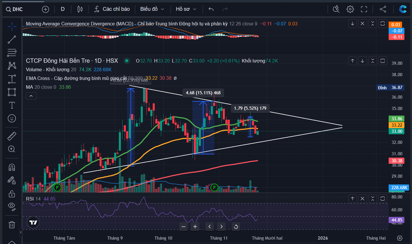 DHC đang có dấu hiệu hình thành mẫu hình tam giác cân, tuy nhiên chưa xuất hiện điểm break giá để vào lệnh hợp lý!