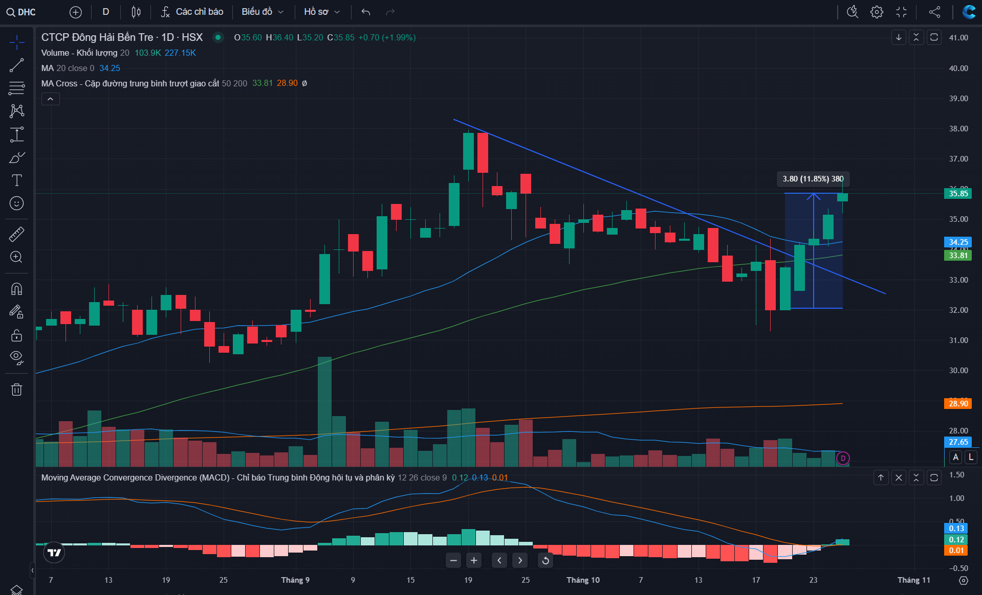 Sau phiên giảm cùng thị trường chung, xu hướng giá của DHC khá tốt khi vượt trendline ngắn hạn của cổ phiếu, với mức tăng khoảng 12% với giá đóng cửa ngày 20/10