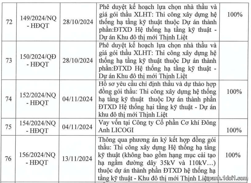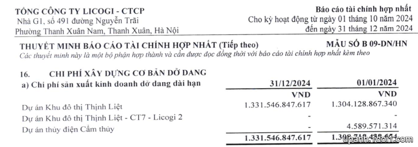 Tổng Công ty Licogi thuyết minh chi phí xây dựng cơ bản dở dang chủ yếu là công ty ghi nhận 1.331,5 tỷ đồng dự án Khu đô thị Thịnh Liệt, chiếm 28,5% tổng tài sản. Trong đó, dự án Khu đô thị Thịnh Liệt với quy mô 351.422 m2, quy mô dân số khoảng 9.000 người bao gồm các sản phẩm biệt thự, nhà vườn, nhà ở cao tầng…