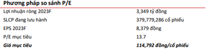 Chúng tôi đưa ra khuyến nghị MUA đối với cổ phiếu DGC với giá mục tiêu cho năm 2023 ở mức 114.000 đồng/cổ phiếu (+20% so với mức giá tại ngày 02/12/2023) bằng phương pháp P/E (với P/E mục tiêu năm 2023 là 13.7x).
