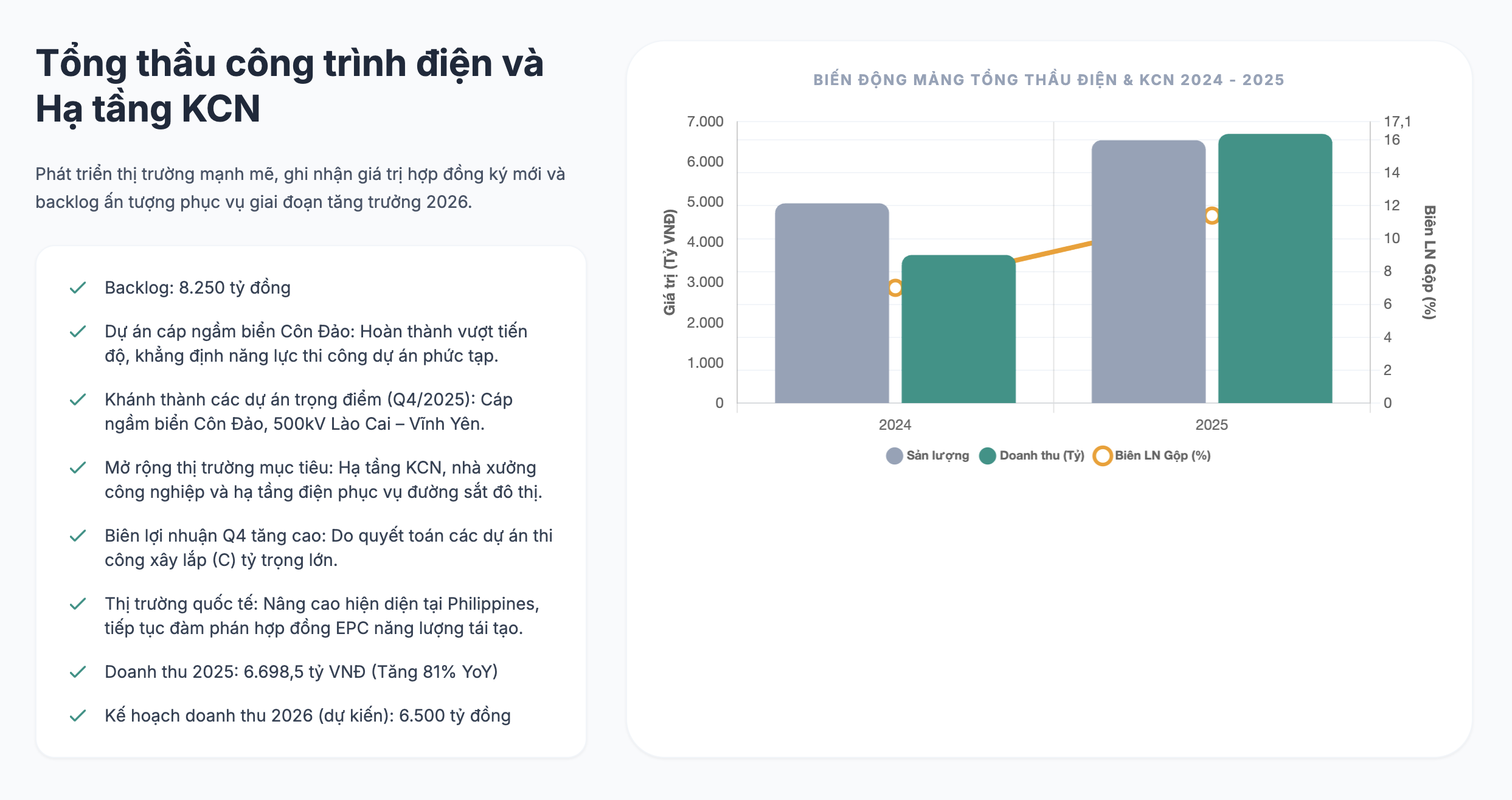 Thứ ba là backlog của mảng xây lắp cuối năm 2025 chuyển sang 2026 vào khoảng 7.000 tỷ đồng, PC1 đang được hưởng lợi chính sách vĩ mô đầu tư hạ tầng điện một cách rõ nét. Mảng xây lắp tốt sẽ kéo theo mảng sản xuất công nghiệp cũng sẽ tăng trưởng một cách tích cực, hai mảng này mang về khoảng 1.700 tỷ lãi gộp mỗi năm.