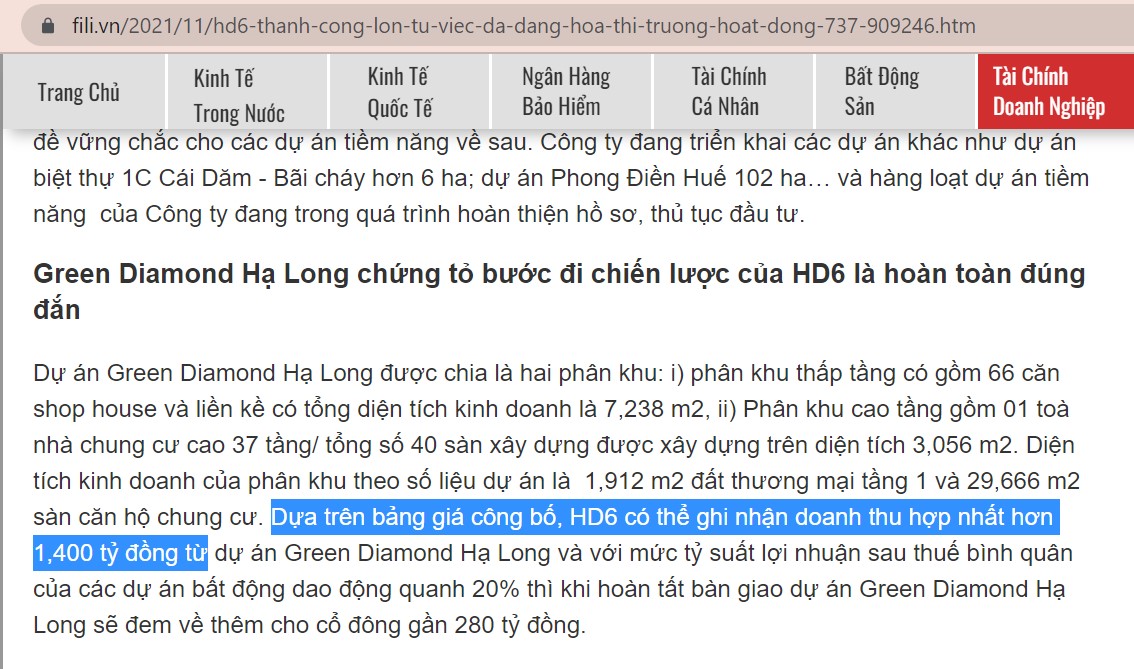 Dự án Green Diamond Hạ Long. Doanh số ước tính là trên 1400 tỷ, lợi nhuận ước tính thu được 300 tỷ. Lợi nhuận chưa book khoản 190 tỷ. Hàng tồn kho ghi nhận trên sổ sách khoản 650 tỷ.