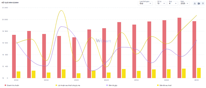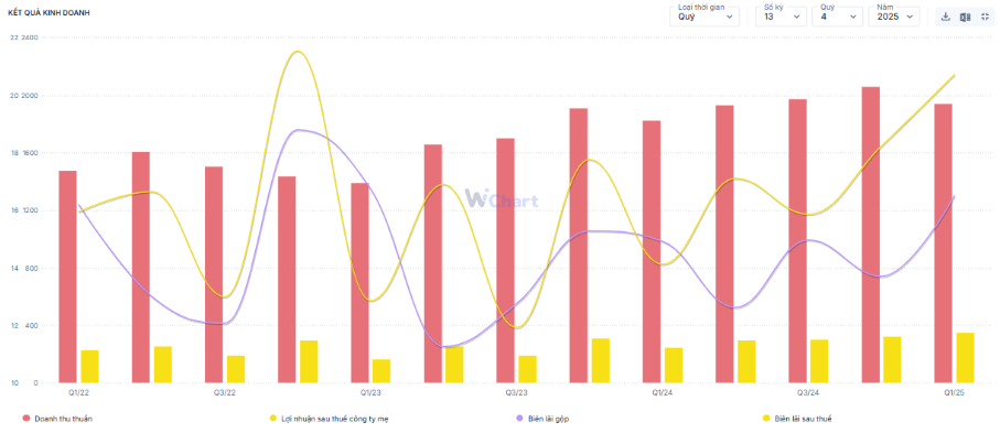 Như vậy, với kết quả đã đạt được trong Q1/25 vừa qua, công ty đã hoàn thành 33,5% kế hoạch doanh thu và 48,3% chỉ tiêu về lợi nhuận. Năm 2025, công ty cũng đặt kế hoạch khá thận trọng trong bối cảnh thuế quan vẫn còn nhiều điều bỏ ngỏ. Cụ thể, công ty đặt chỉ tiêu doanh thu và lợi nhuận lần lượt là 5.657 tỷ (-28% yoy) và 833 tỷ đồng (-35% yoy).